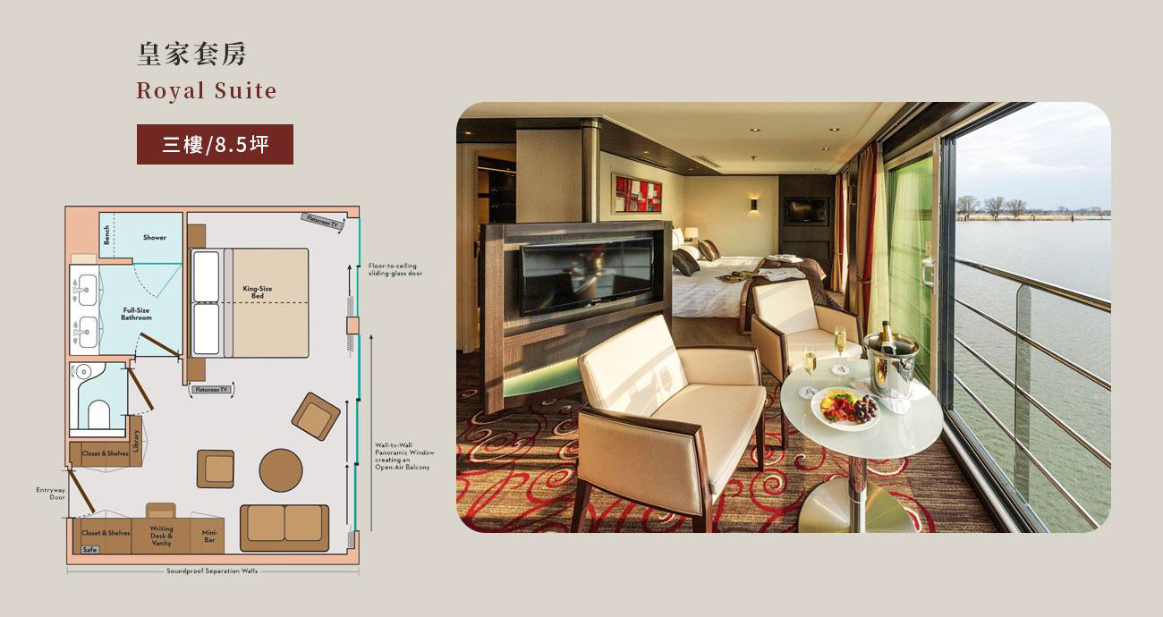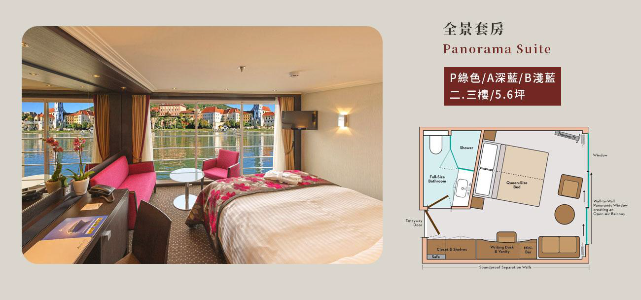 每艘Avalon Suite Ship®擁有80%的全景套房,提供河流巡航中最開闊的視野。寬敞的套房設計確保乘客不會感到擁擠,您可以在露天Sky Deck悠閒一下,或者在Panorama Lounge和Observation Lounge放鬆身心,隨時享受舒適自在的空間。