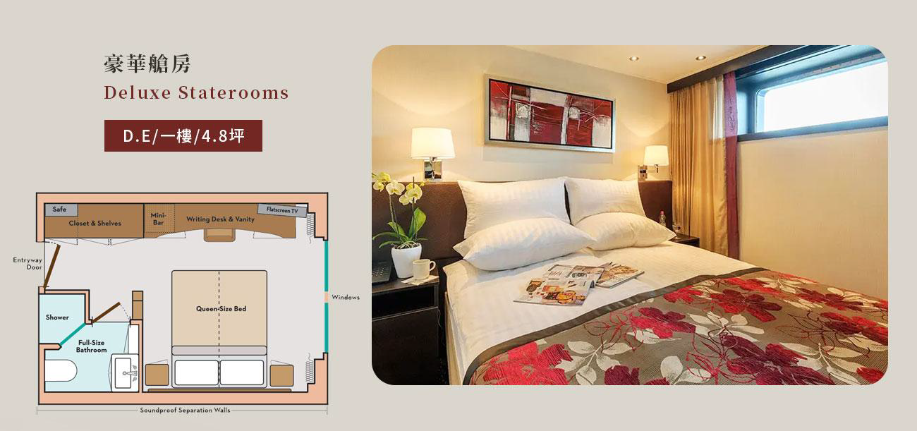 我們的Comfort Collection SM 床墊與高品質枕頭、埃及棉床單、豪華浴室設施(如大理石淋浴間和L'Occitane®沐浴產品),加上豐富的娛樂選擇與全船免費Wi-Fi,讓您在這裡有如回到家一般的舒服享受。