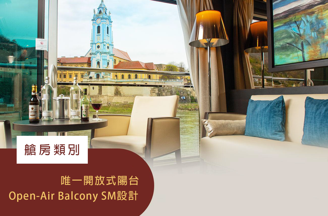 ●艾凡隆 AVALON 河輪採河輪唯一的開放式陽台(Open-Air Balcony SM)設計,落地窗前就是潺潺流水,讓床與景色之間零距離,可以享受更大的視野、更多的空間及全天候的露天巡航。